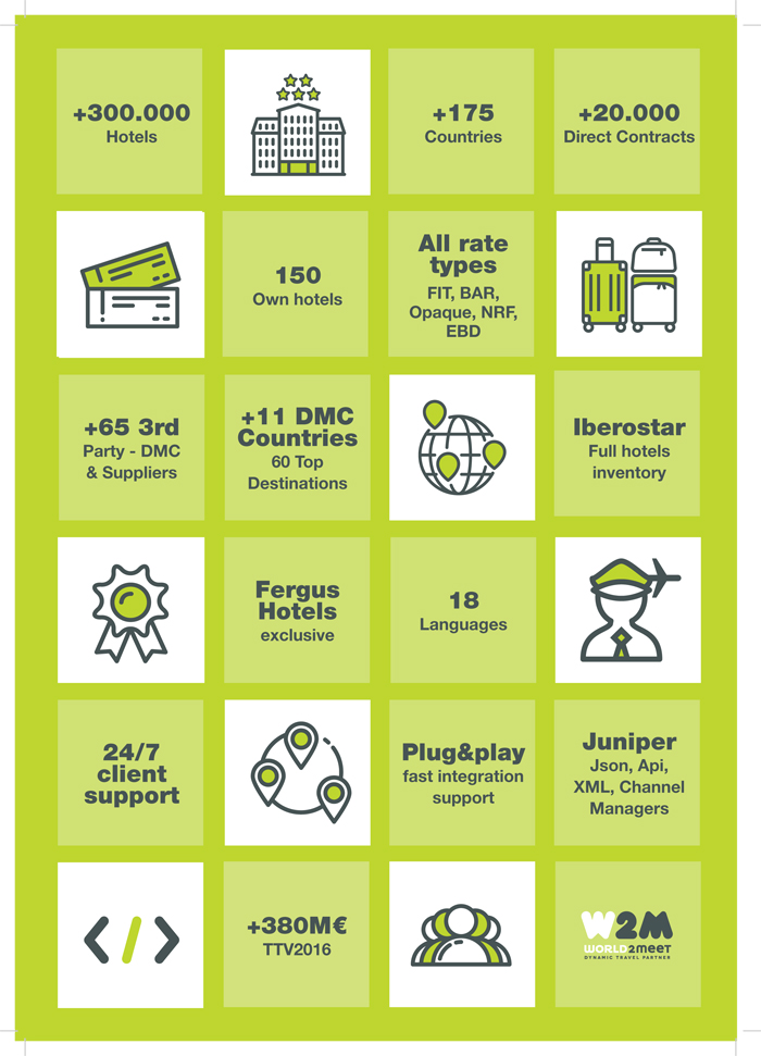 W2M is engaged in three business fields; the biggest independent DMC in Spain, travel component supplier with an inventory of more than 265000 properties worldwide, distributed via API or web interface and Spanish leading tour operator for medium and long-haul destination, distributing in Spain, Portugal and Italy.